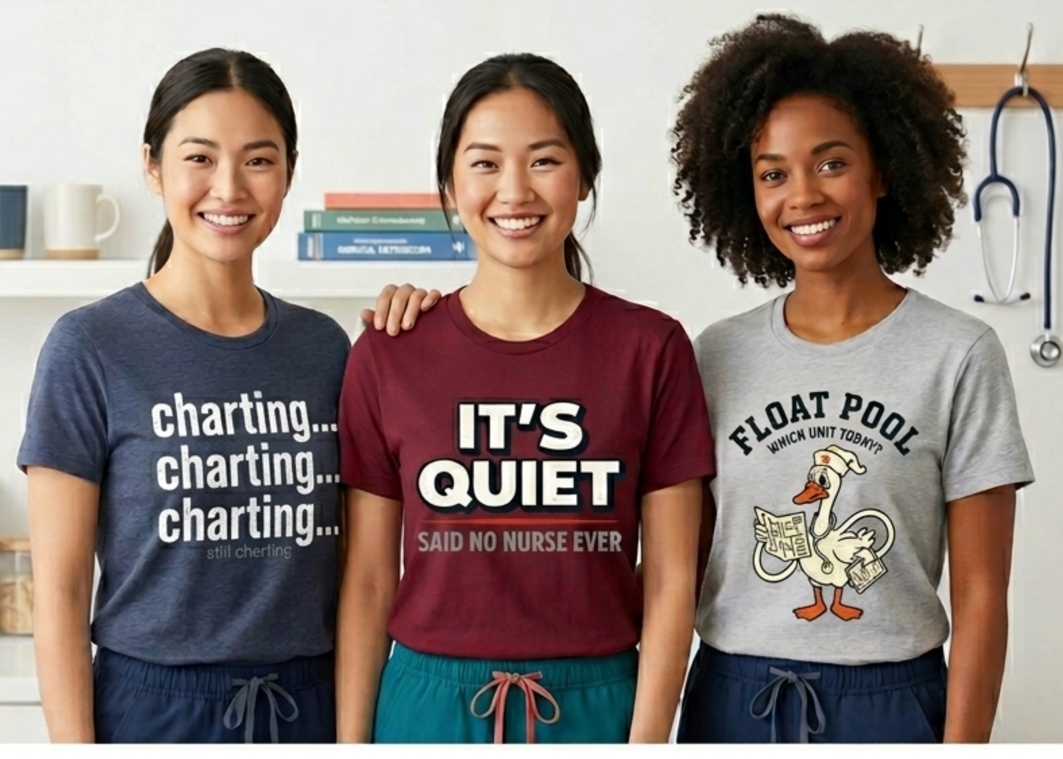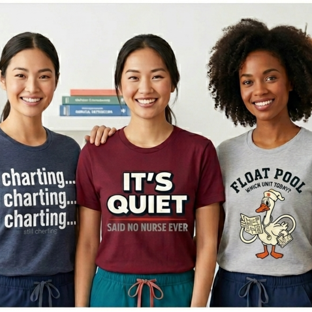 We use high-quality, comfy materials for all our tees—soft enough for a 12-hour shift, durable enough to survive the laundry cycle after a code brown, and gentle enough that you won't want to rip it off the second you get home. Exact materials vary by item, but you'll find all the specs on each product page.